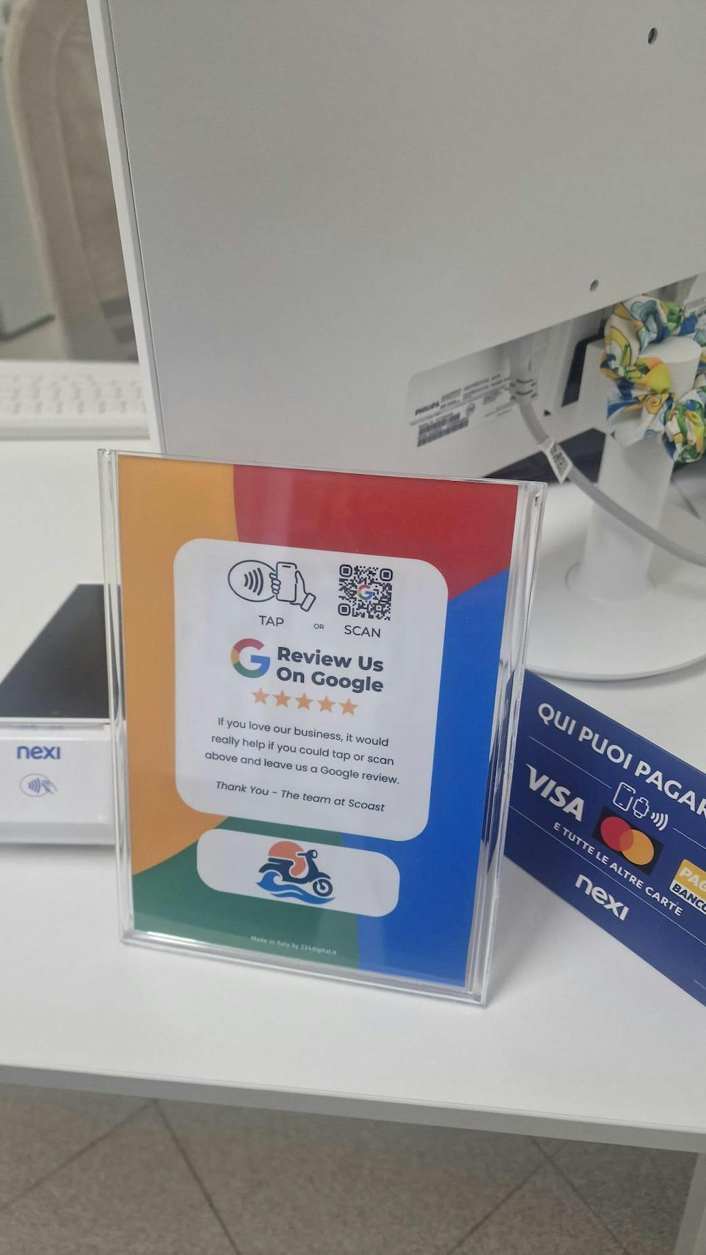 Quando un Cliente dice di apprezzare la tua attività, consegnagli questa Card e chiedigli di avvicinare il proprio smartphone oppure di scansionare il QR-code stampato. La Tua pagina per Recensioni Google si aprirà all'istante, così potrà lasciare una recensione immediatamente. Nessuna app, nessuna ricerca e nessuna configurazione.